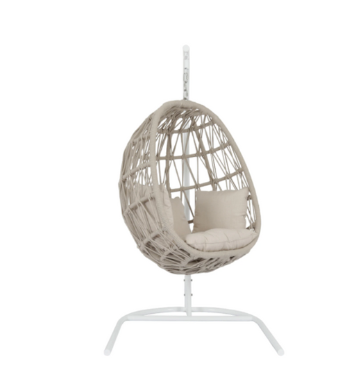 This Hanging Chair is the perfect balance between intricate pattern combined with an organic, free flowing aluminum structure. The egg-shaped frame is expertly wrapped in premium all-weather olefin rope in natural Linen, and styled with 4 tufted cushions for maximum comfort.