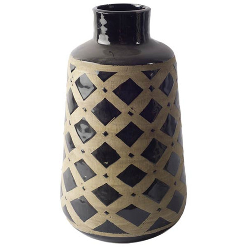 Short ceramic vase, with black glaze and white diagonal lattice pattern.