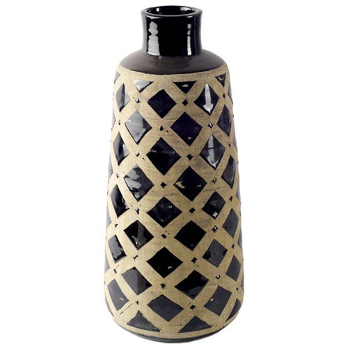 Short ceramic vase, with black glaze and white diagonal lattice pattern.